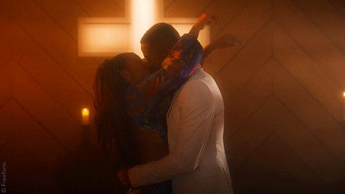 And as Zoey’s intro voiceover continues last week’s discussion of fate and how hard it worked to bring her and Aaron together, we get a closer look into their last-minute wedding ceremony: candelabras in a dimly lit church, glowing cross behind the altar, as Zo and Aaron stand before a pastor who pronounces them husband and wife.